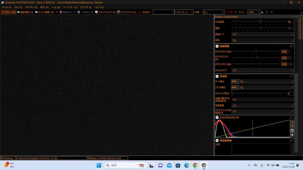 コントロールパネルを下にスクロールするとヒストグラムが出てきます。右下の小さなグラフエリアがヒストグラムです。ここで見やすい画質に調整します。ヒストグラム機能もよく使います。リアル観測での画質の調整はこちらのヒストグラムを使用します。