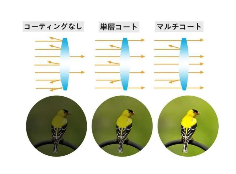 レンズにコーティングをして反射を防ぎます。たくさんの光を取り込んでゴーストなどの発生を抑えます。見え味にかなり影響します。