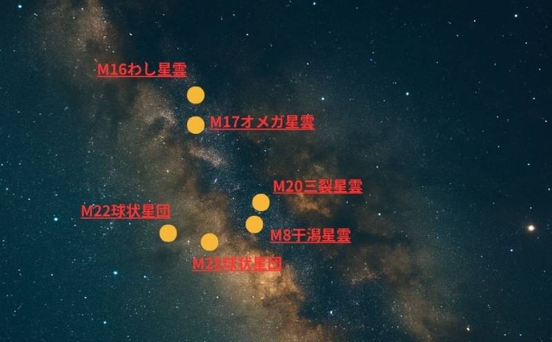 ●わし星雲M16、オメガ星雲M17、三裂星雲M20、干潟星雲M8、M22球状星団など